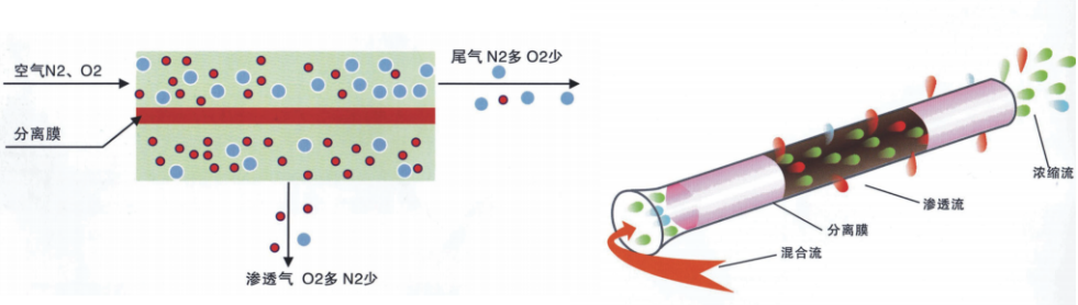 膜分離制氮機技術是根據(jù)空氣中的氮氣和氧氣在膜兩側(cè)壓差作用下,在膜中的溶解度和擴散系數(shù)不同而實現(xiàn)分離的,滲透率快的水蒸汽、氧氣等一些氣體先透過膜,成為富氧氣體,而滲透率較慢的氮氣則滯留富集,成為干燥的富氮氣體,達到氧氮分離的目的。